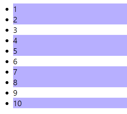 #test3 > li:not(:nth-of-type(3n)) { background-color: rgb(255, 196, 175); }<ul id="test3"> <li>1</li> <li>2</li> <li>3</li> <li>4</li> <li>5</li> <li>6</li> <li>7</li> <li>8</li> <li>9</li> <li>10</li> </ul>