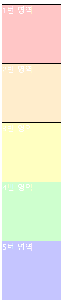 .block{ border : 1px solid black; /* 테두리 1px 검정 실선*/ width: 150px; height: 150px; color : white; /* 글자색 : 흰색*/ display : block; /* 요소의 보여지는 형식을 block으로 지정*/ } .area1{ background-color: rgb(255, 198, 198);} .area2{ background-color: rgb(255, 237, 204);} .area3{ background-color: rgb(255, 255, 193);} .area4{ background-color: rgb(206, 255, 206);} .area5{ background-color: rgb(197, 197, 255);}