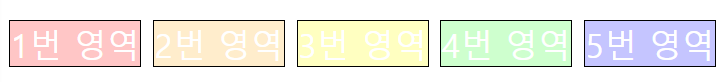 <div class="block area1 inline">1번 영역</div> <div class="block area2 inline">2번 영역</div> <div class="block area3 inline">3번 영역</div> <div class="block area4 inline">4번 영역</div> <div class="block area5 inline">5번 영역</div>block 클래스에서 크기를 고정해줬지만