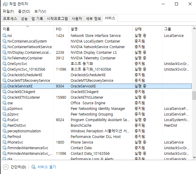 해결 : 작업관리자가서 오라클을 시작 시키고 cmd에서 다시 진행