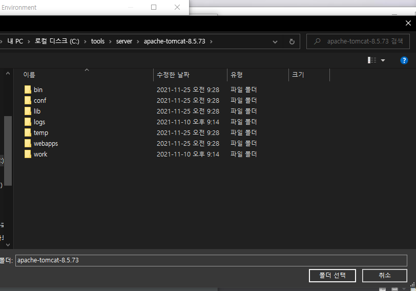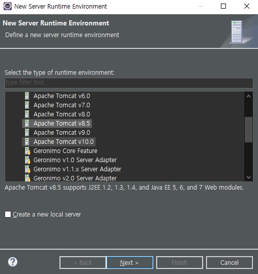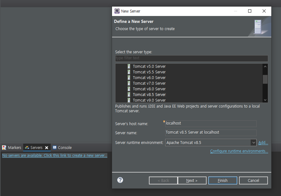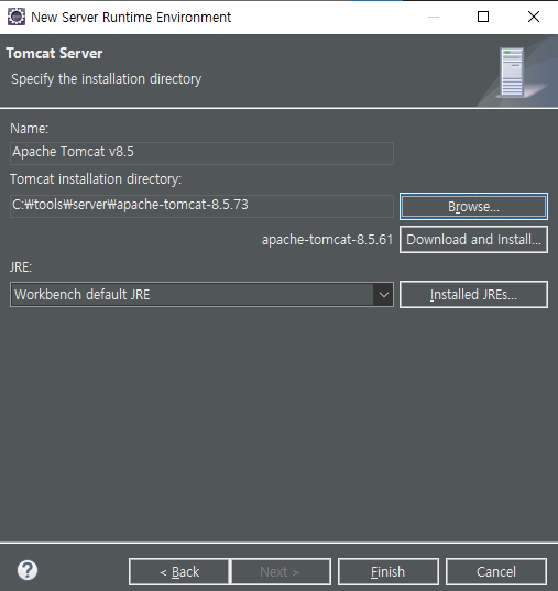 - 서버가 실행할 실행환경 선택한 후 설치한 버전의 톰캣 선택