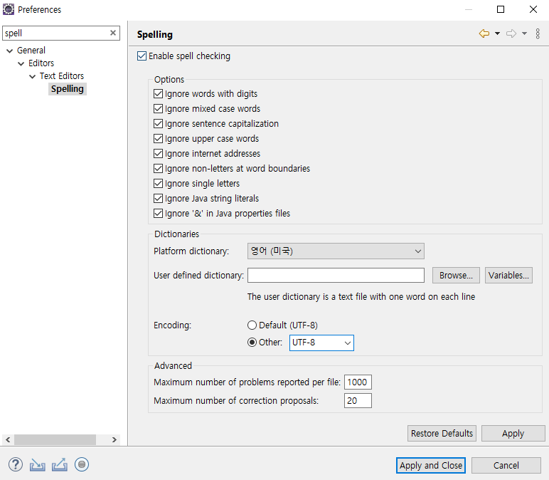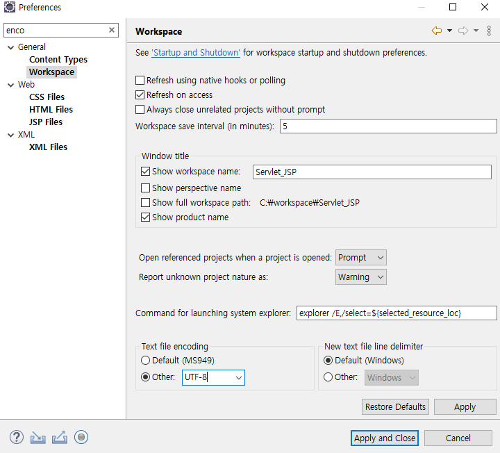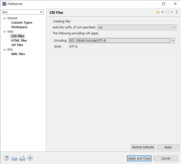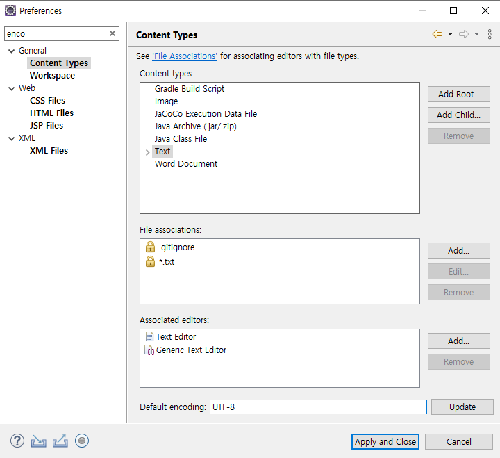 : text 선택만 한 상태에서 default encoding에 'UTF-8' 작성 -> Update