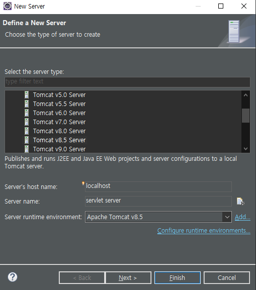 - Server창에서 create a new server - 사용할 버전의 Tomcat 선택 - 이름 servlet server로 바꿔주기(선택사항)