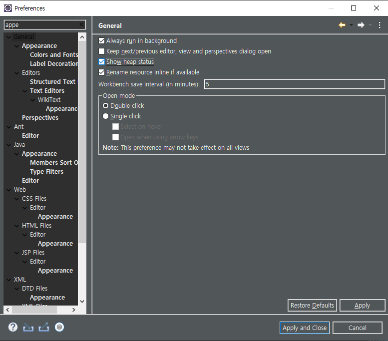 이클립스 다시 키면 실제로 할당된 메모리와 사용중인 메모리를 확인할 수 있고