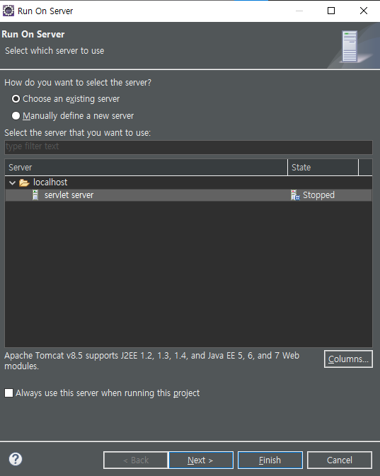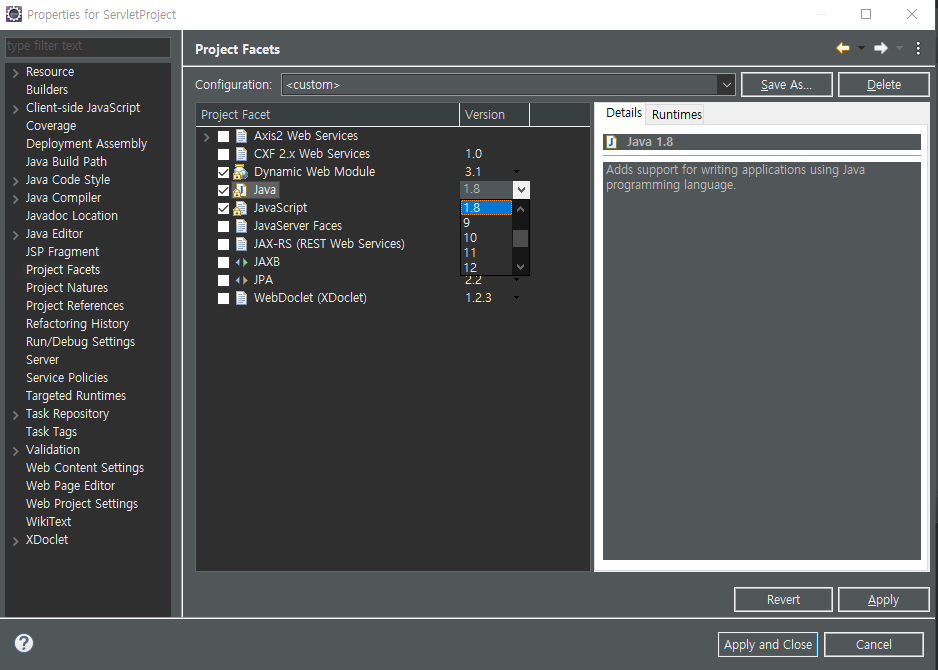 프로젝트가 실행될때 어떤 버전으로 실행할건지(위에서 미리 지정했던 톰캣 버전으로 실행됨)