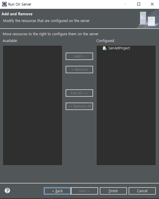Configured에서 실행할 프로젝트의 서버가 맞는지 확인 -> Finish