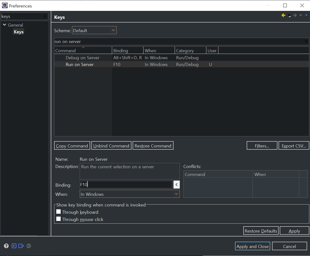 참고) 단축키 설정시 기존 단축키와 겹치면 Conflicrs에서 Debug 충돌이 일어난다