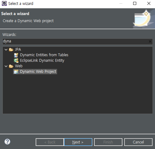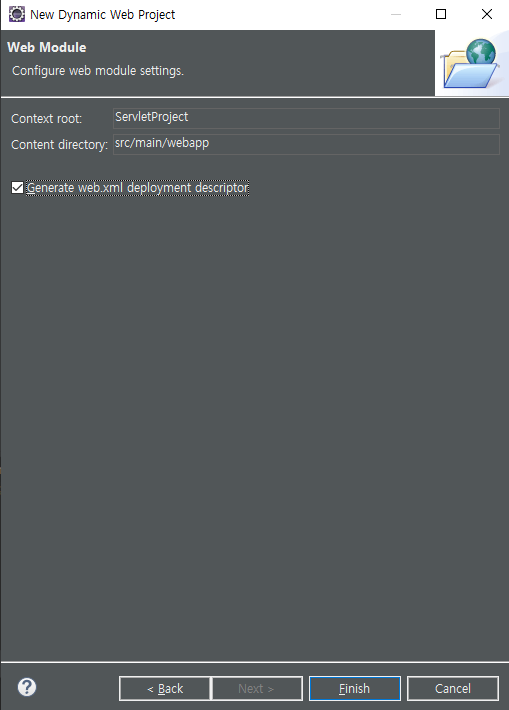 이클립스에서 이떄까지는 자바 프로젝트를 생성해 main메서드가 필요한 형태였지만 Servlet에서는 서버가 실행 해준다