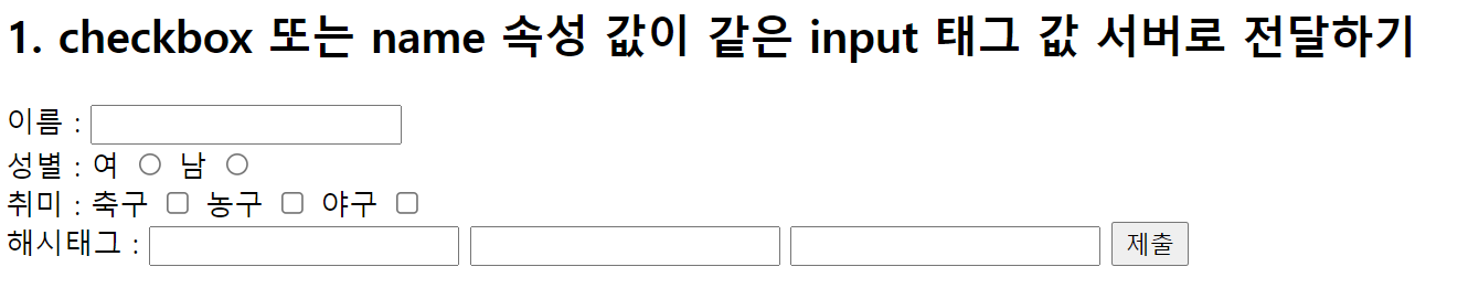 <h2>1. checkbox 또는 name 속성 값이 같은 input 태그 값 서버로 전달하기</h2>