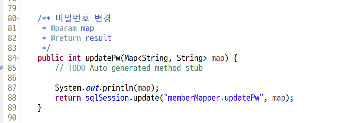 내가 쓴건 cuurentPw여서 오타를 해결해도 값이 넘어가지 않았다. 계속 찾아보다가 DAO에서 update문을 사용했어야하는데 selectOne을 써서 발생한 문제였다