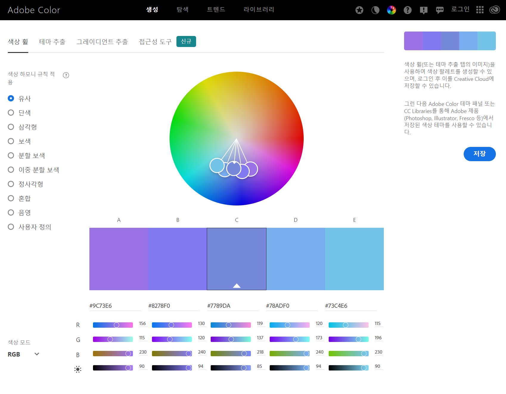 좌측에 유사, 단색, 삼각형, 보색, 분할 보색 등 모드를 선택할 수 있고