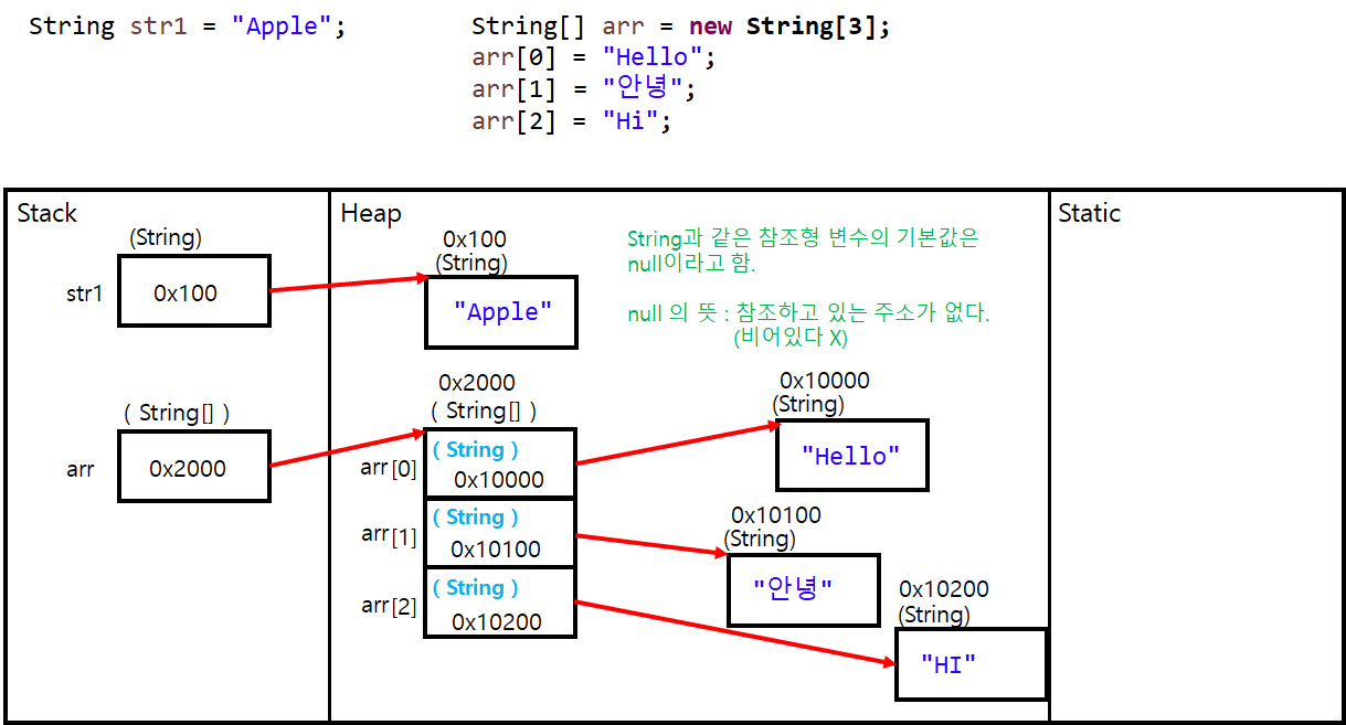 String str1 = "Apple"; String str2 = "Banana"; String[] arr = new String[3]; arr[0] = "Hello"; arr[1] = "안녕"; arr[2] = "Hi"; System.out.println(str1); //str1에는 "Apple"이 저장되어있는 Heap영역 주소가 저장된다. System.out.println(str2); //주소가 아닌 주소에 저장된 값을 참조하여 출력 for(int i =0; i<arr.length; i++) { System.out.println(arr[i]); }