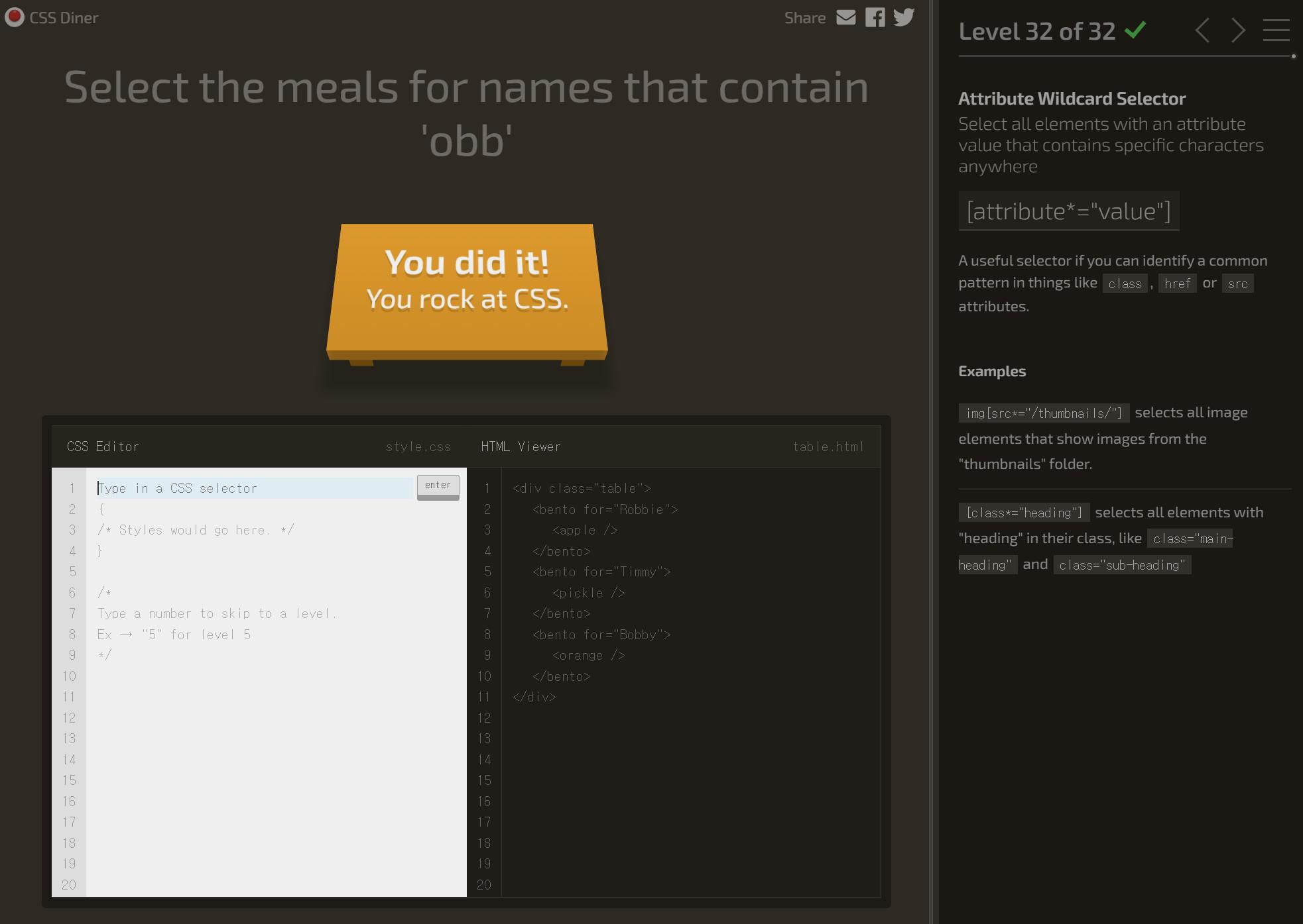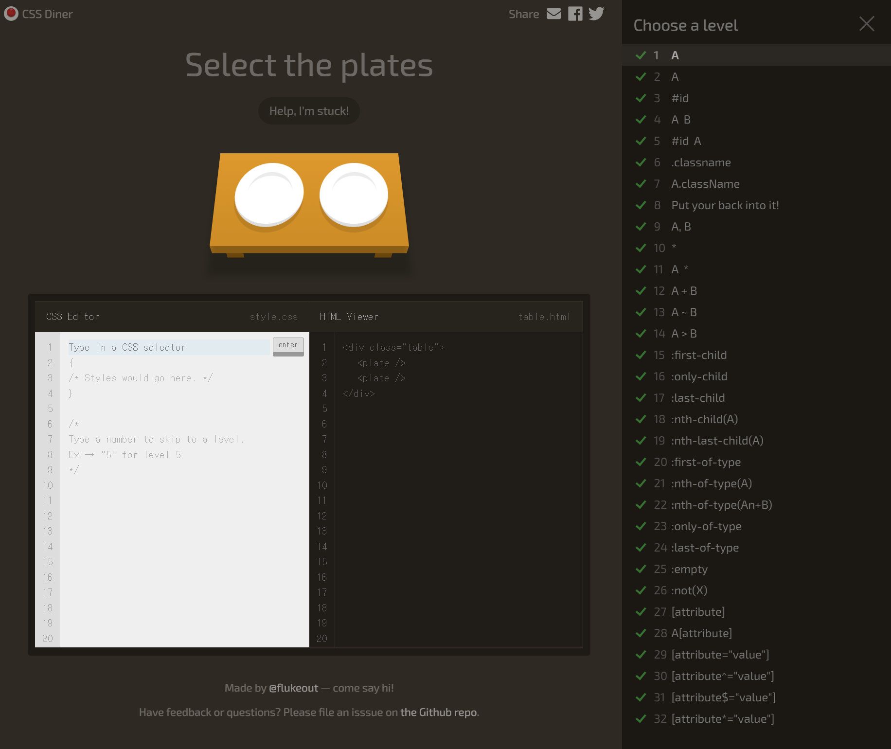 접시와 음식들이 나오면서 움직이는 요소들을 선택하는것으로 전부 외우지 못했어도 오른쪽에 어떤 선택자를 이용하라고 알려준다. CSS 관련 게임들도 여러개 있는데 flex관련이라 자세한건 flex글에서 다루겠다.