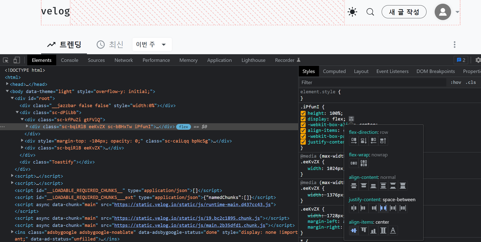 컨텐츠를 정렬하거나 공간을 나눌 수 있는 CSS 속성의 집합으로 정말 정렬할 때 유용한 속성이다. float보다 사용하기 편해서 자주 사용했고 아래 이미지처럼 헤더 부분의 공백을 두고 양 끝에 콘텐츠들을 배치할 때 유용하다.