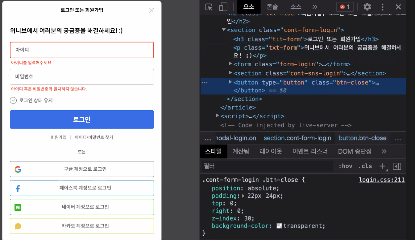 - HTML구조에서 '로그인 또는 회원가입' 바로 뒤에 있는것이 아니라 그 영역 바깥에 따로 배치해주어야한다.