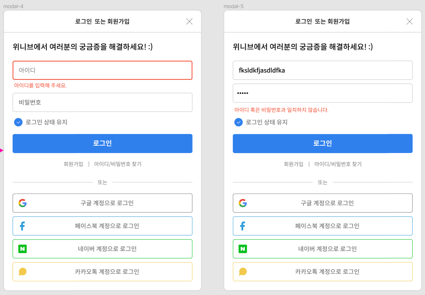 위의 두 모달창을 만들어오는 과제로 JS는 선택이었다.