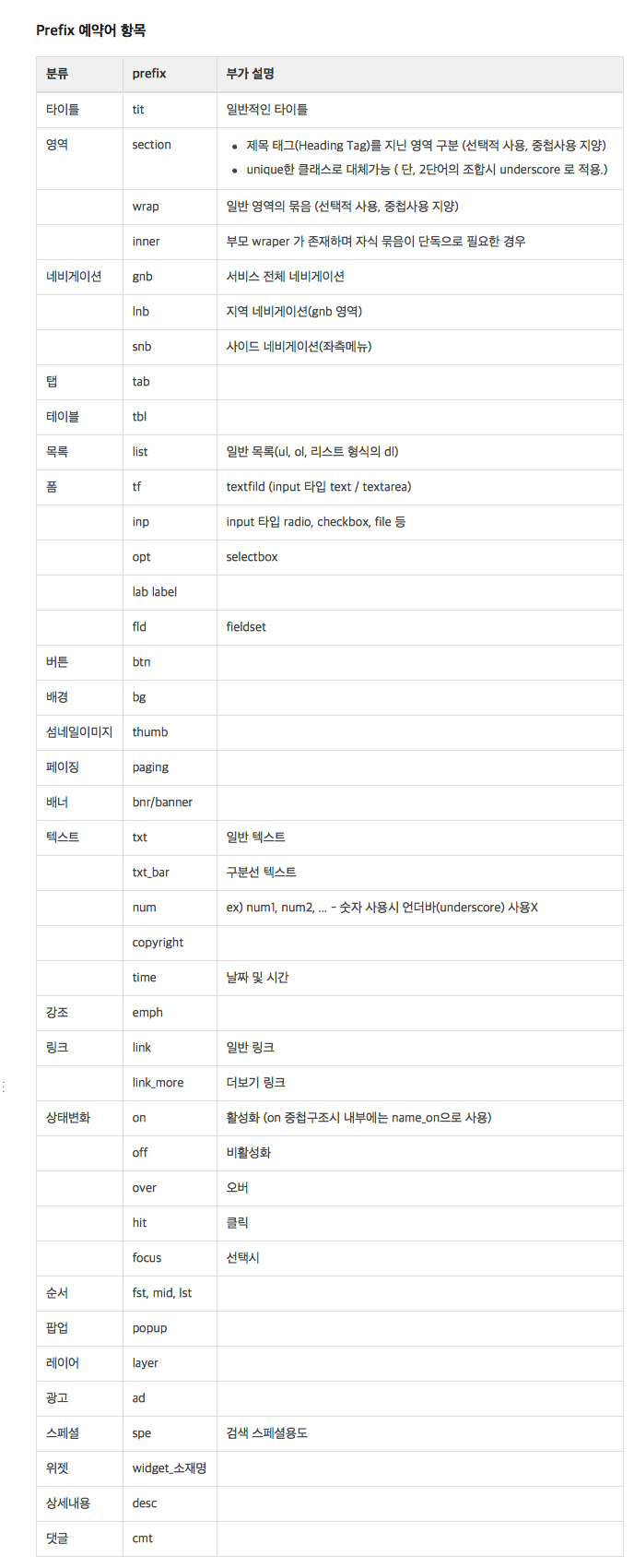 그리고 css에서 동일한 이름을 정하기도 하는데 이건 회사마다 다르다고한다. 아래 사진은 참고용으로 좋다.