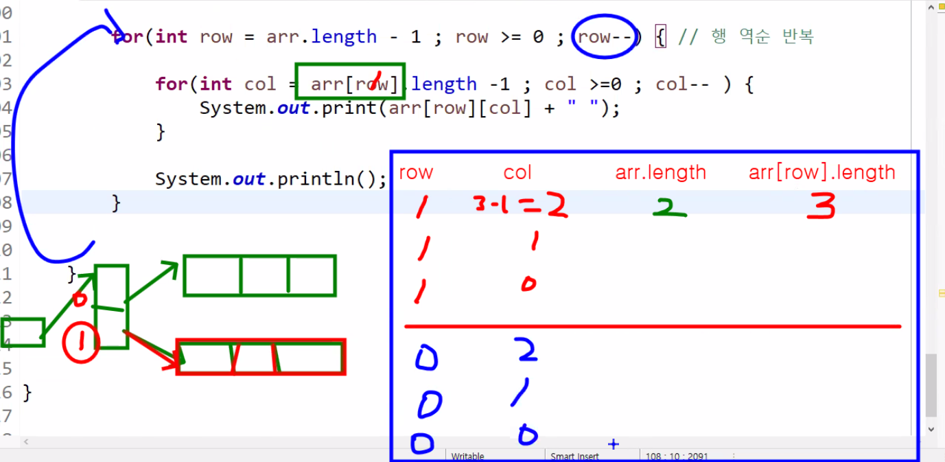 for(int row = arr.length -1; row>=0 ; row --) { //행 역순, -1해주는 이유는 인덱스 번호는 543210이기 때문 for(int col = arr[row].length-1; col >=0; col--) { System.out.print(arr[row][col]+ " "); //for문 방향을 바꿔서 --..? } System.out.println(); }