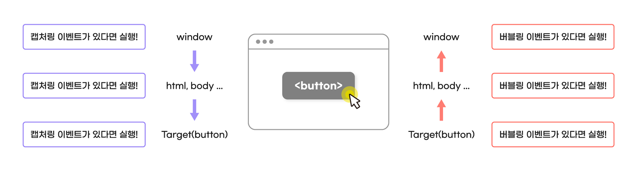 캡처링은 가장 상위 노드부터 이벤트 발생(ex. click) 노드까지 타고 내려오는것 버블링은 이벤트 발생 노드에서 상위노드까지 돌아가는 것 버블링이벤트가 디폴트값
