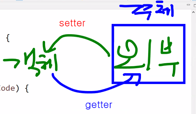 ➡ 캡슐화했을때 내부와 연결할 수있는 통로를 만들어야한다. 속성에 직접접근이 안되므로 간접접근 방법을 제공