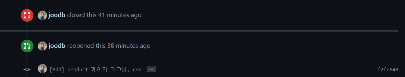 pull request을 closed한 상태에서 하면 안되고 꼭 open된 상태에서 진행해야한다. 만약 closed해버렸다고해도 해당 pull request로 가서 Reopen pull request하면 된다.