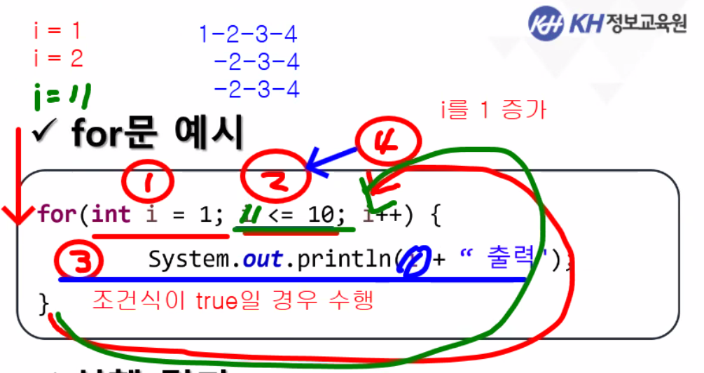 - 증감식 : 초기식에 사용된 변수를 for문이 종료할 때 마다 증가 또는 감소시켜 조건식의 결과를 변화하게한다.