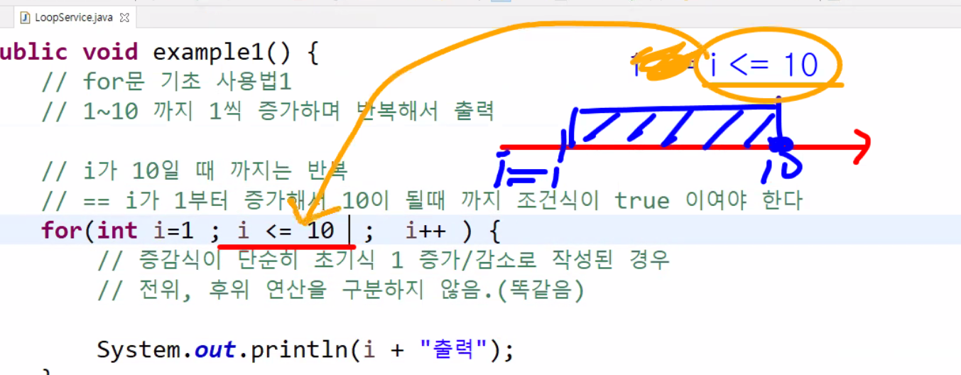 - 초기식 : for문 내부에서 사용할 변수. 보통 for문의 반복 제어를 위해 사용한다.