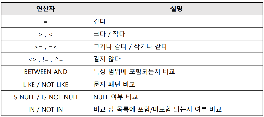 단, 비교하는 두 컬럼 값/표현식은 서로 동일한 데이터 타입이어야 한다.