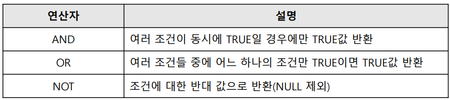 : 행을 선택하는 조건 기술 여러 개의 제한 조건을 포함할 수 있으며, 각각의 제한 조건은 논리 연산자로 연결 제한 조건을 만족시키는 행들만 Result Set에 포함