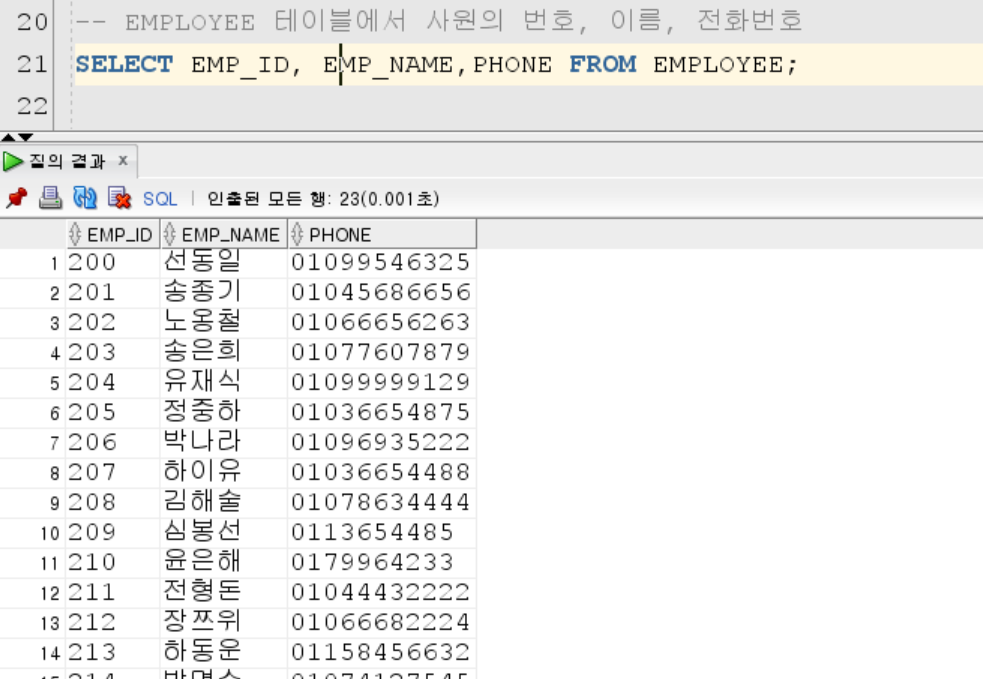 ➡ 처리 순서: 조회-SELECT > 조회내용 > 조회테이블 FROM EMPLOYEE > 조건 WHERE