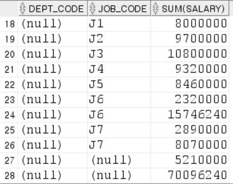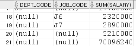예제 1.각 부서에 소속된 직급별 급여 합,부서별 급여 합,전체 급여 합 조회 SELECT DEPT_CODE, JOB_CODE, SUM(SALARY) FROM EMPLOYEE GROUP BY CUBE( DEPT_CODE, JOB_CODE ) ORDER BY 1;
