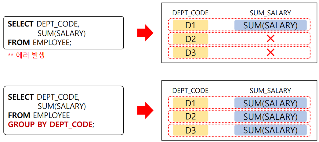 그룹 함수는 단 한 개의 결과 값만 산출하기 때문에 그룹이 여러 개일 경우 오류 발생 여러 개의 결과 값을 산출하기 위해 그룹 함수가 적용될 그룹의 기준을 GROUP BY절에 기술하여 사용