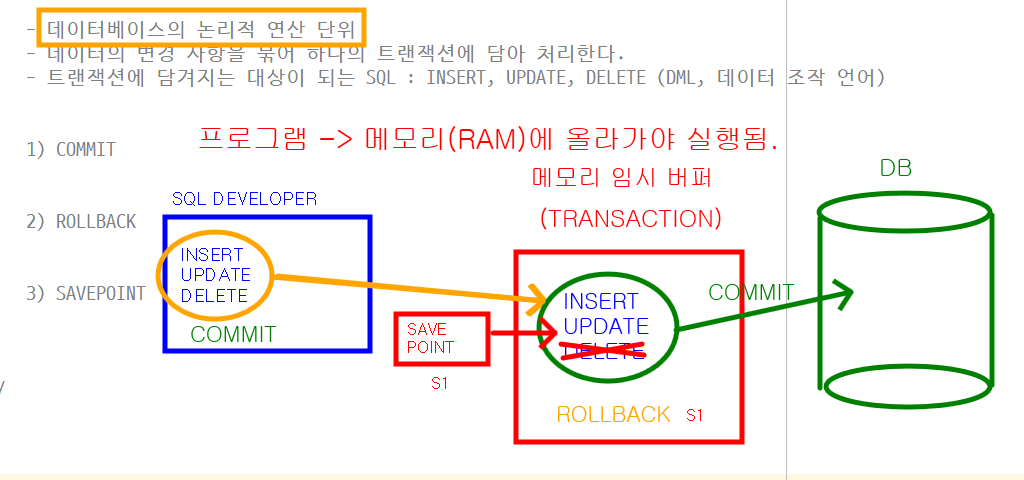 SQL DEVELOPER에서 INSERT, UPDATE, DELETE 작성 시 바로 DB에 반영되는것이 아니라 메모리 임시버퍼에서 COMMIT 해야 DB에 반영된다.