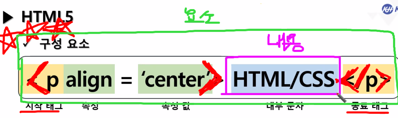 시작 태그+ 종료태그 + 내용= 요소