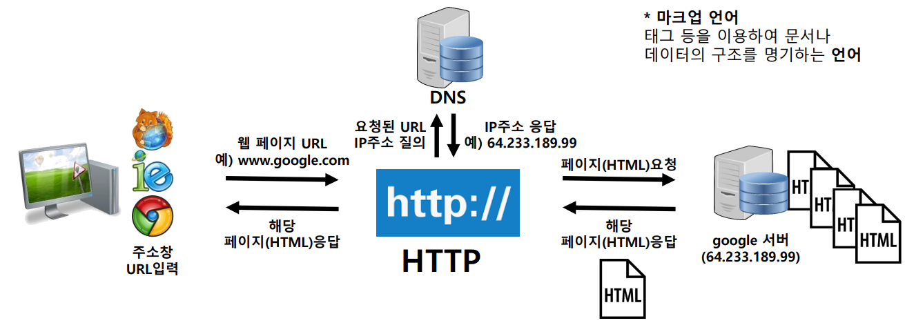 : 네트워크를 통해 서로 연결된 컴퓨터들 간에 서버와 클라이언트의 역할을 나누고 HTML이라는 마크업(Markup) 언어를 통해 자료를 주고 받음