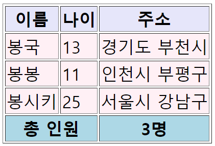 <table border = "1"> <thead> <tr> <th>이름</th> <th>나이</th> <th>주소</th> </tr> </thead> <tbody> <tr> <td>봉국</td> <td>13</td> <td>경기도 부천시</td> </tr> <tr> <td>봉봉</td> <td>11</td> <td>인천시 부평구</td> </tr> <tr> <td>봉시키</td> <td>25</td> <td>서울시 강남구</td> </tr> </tbody> <tfoot> <tr> <td colspan="2"> 총 인원</td> <td> 3명</td> </tr> </tfoot> </table>