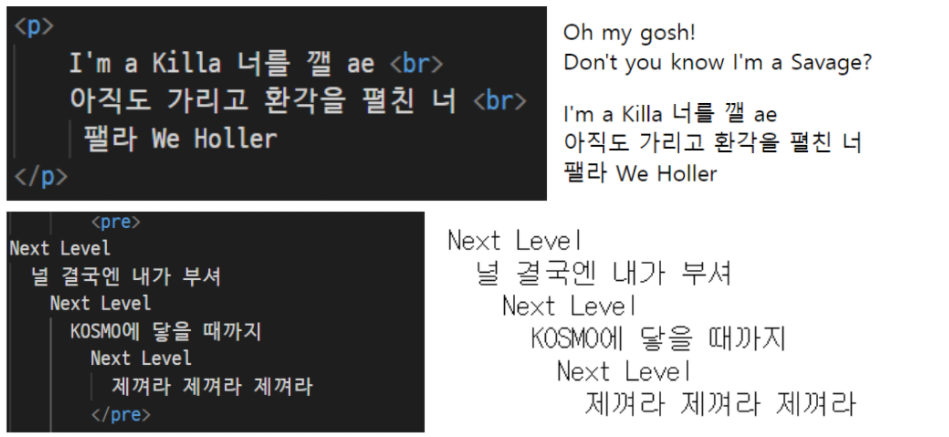 : pre 태그는 앞에 들여쓰기도 화면에 출력되기 때문에 들여쓰기를 무시하고 작성하는 경우가 많고 이렇게 되어있으면 페이지 운영 시 코드가 더러워서 잘 안쓰인다.