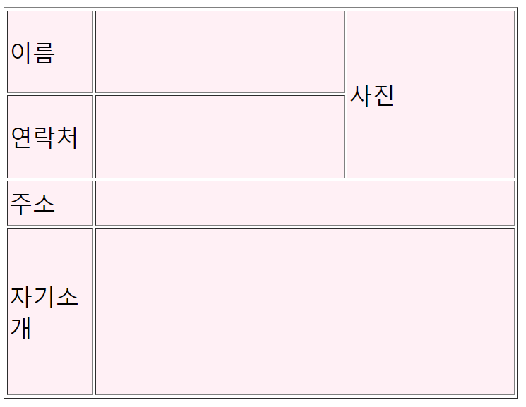 <table border="1"> <tr> <td width="70px">이름</td> <td width="210px"></td> <td width="140px" height = "140px" rowspan ="2">사진</td> </tr> <tr> <td>연락처</td> <td></td> </tr> <tr> <td height = "35px"> 주소</td> <td colspan ="2"></td> </tr> <tr> <td height = "140px">자기소개</td> <td colspan ="2"></td> </tr> </table>