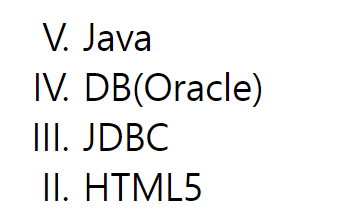 순서가 없기때문에 점으로만 표시 ol type = "I" start = "5" reversed> <li>Java</li> <li>DB(Oracle)</li> <li>JDBC</li> <li>HTML5</li> </ol>