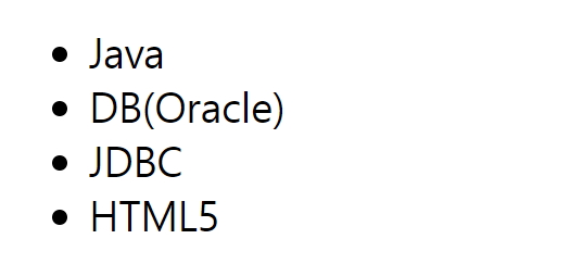 <ul> <li>Java</li> <li>DB(Oracle)</li> <li>JDBC</li> <li>HTML5</li> </ul>순서가 없기때문에 점으로만 표시 ol type = "I" start = "5" reversed> <li>Java</li> <li>DB(Oracle)</li> <li>JDBC</li> <li>HTML5</li> </ol>reversed했기때문에 5부터역순