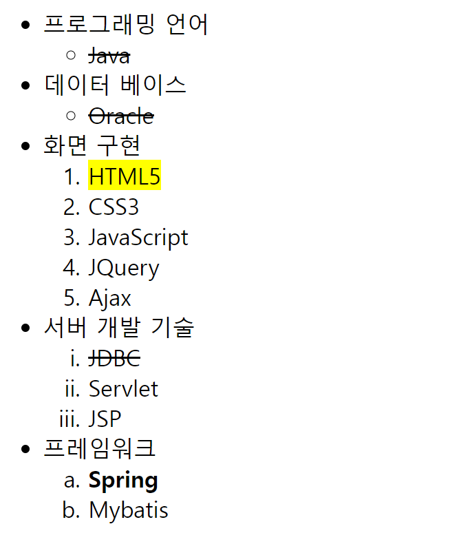 <ul> <li> 프로그래밍 언어 </li> <ul> <li><s>Java</s></li> </ul> <li> 데이터 베이스 </li> <ul> <li><s>Oracle</s></li> </ul> <li> 화면 구현 </li> <ol> <li><mark>HTML5</mark></li> <li>CSS3</li> <li>JavaScript</li> <li>JQuery</li> <li>Ajax</li> </ol> <li>서버 개발 기술 </li> <ol type = "i"> <li><s>JDBC</s></li> <li>Servlet</li> <li>JSP</li> </ol> <li>프레임워크</li> <ol type = "a"> <li><strong>Spring</strong> </li> <li>Mybatis</li> </ol> </ul>
