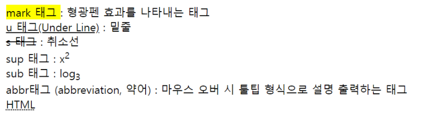 <mark> mark 태그 </mark> : 형광펜 효과를 나타내는 태그 <br> <u> u 태그(Under Line)</u> : 밑줄 <br> <s> s 태그</s> : 취소선 <br> sup 태그 : x<sup>2</sup> <br> sub 태그 : log<sub>3</sub> <br> abbr태그 (abbreviation, 약어) : 마우스 오버 시 툴팁 형식으로 설명 출력하는 태그 <br> <abbr title = "Hyper Text MarkUp Language"> HTML</abbr>