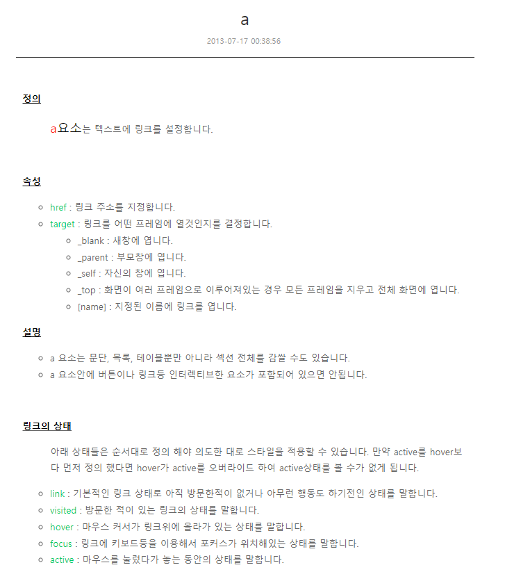 : 각 태그마다 정의와 설명, 그리고 예제를 같이 보여주기 때문에 이해하는데 더욱 도움이 됩니다.