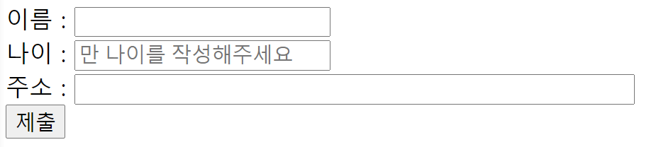 <form> 이름 : <input type="text" name="inputName" maxlength="4"><br> 나이 : <input type="text" name="inputAge" placeholder="만 나이를 작성해주세요"><br> 주소 : <input type="text" name="inputAddr" size="50"><br> <input type="submit" value="제출"> </form>