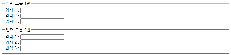 <form> <fieldset> <legend>입력 그룹 1번</legend> 입력 1 : <input type="text"><br> 입력 2 : <input type="text"><br> 입력 3 : <input type="text"><br> </fieldset> <fieldset> <legend>입력 그룹 2번</legend> 입력 1 : <input type="text"><br> 입력 2 : <input type="text"><br> 입력 3 : <input type="text"><br> </fieldset> </form>