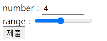 <form> number : <input type="number" name="number" min="0" max="9999" step="2" value="4"> <br> range : <input type="range" name="range" min="0" max="9" step="2" value="4"> <br> <input type="submit" value="제출"> </form>
