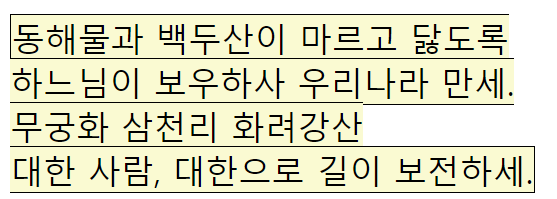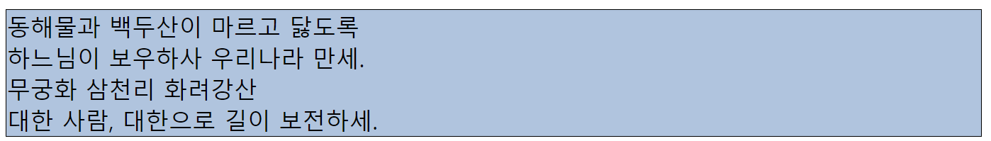 <div style="background-color: lightsteelblue;"> 동해물과 백두산이 마르고 닳도록 <br> 하느님이 보우하사 우리나라 만세. <br> 무궁화 삼천리 화려강산 <br> 대한 사람, 대한으로 길이 보전하세. <br> </div> <span style="background-color: lightgoldenrodyellow;"> 동해물과 백두산이 마르고 닳도록 <br> 하느님이 보우하사 우리나라 만세. <br> 무궁화 삼천리 화려강산 <br> 대한 사람, 대한으로 길이 보전하세. <br> </span>