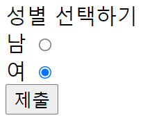 <form> 성별 선택하기 <br> 여 <input type="radio" name="gender" value="F" checked> <br> 남 <input type="radio" name="gender" value="M"> <br> <input type="submit" value="제출"> </form>p