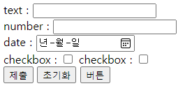 <form> text : <input type="text"> <br> number : <input type="number"> <br> date : <input type="date"> <br> checkbox : <input type="checkbox" name="check" value=1> checkbox : <input type="checkbox" name="check" value=2> <br><br> <input type="submit" value="제출"> <input type="reset" value="초기화"> <input type="button" value="버튼" id="btn"> </form>