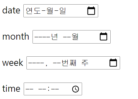<form> <label>date</label> <input type="date" name="dateIn"><br><br> <!-- 2021-10-10 --> <label>month</label> <input type="month" name="monthIn"><br><br> <!-- 2021-10 --> <label>week</label> <input type="week" name="weekIn"><br><br> <!-- 2021-W42 --> <label>time</label> <input type="time" name="timeIn"><br><br> <!-- 14:14 --> </form>